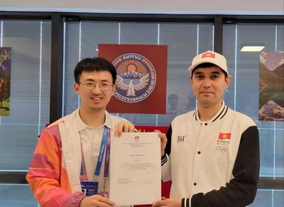 陈诗达同志担任吉尔吉斯斯坦国家奥委会助理。在工作中,陈诗达受邀陪同吉尔吉斯坦副总理考察亚运村;用俄语为该国奥委会主席和运动员协调、解决三百余次交通问题,调度七种交通工具;参与亚运杭州火炬传递工作,担任火炬手一对一俄语翻译。为代表团参见开闭幕式进行全程引导和翻译工作。以上工作获得了代表团团长的高度赞扬,吉尔吉斯坦国家奥委会特致陈诗达同志感谢信和纪念徽章。