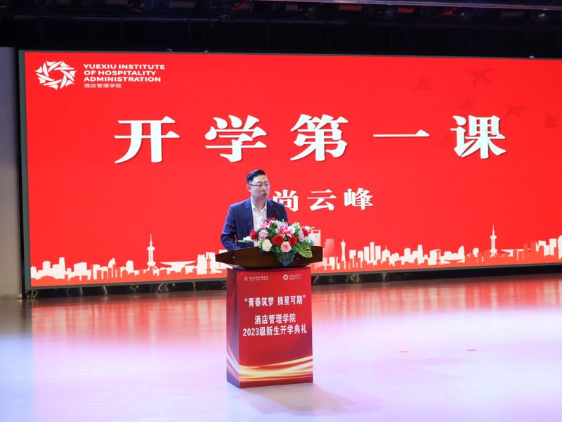 其次,尚院长介绍了学院的基本概况,酒店管理学院自2011年成立以来,便以成为中国乃至世界最好的酒店管理学院为目标,以成为国际文旅教育的重要参与者为使命。尚院长引用梁启超的话提出了大学的4个趣味,即1.劳作;2.游戏;3.艺术;4.学问。大学生活要过得有滋有味,要多参加劳作,要懂得品味艺术,我们有暑期实践、出国交流、志愿者活动、实习实践、学科竞赛,也有运动会、各类文体社团和艺术演出等等丰富多彩活动,期待大家踊跃参与。