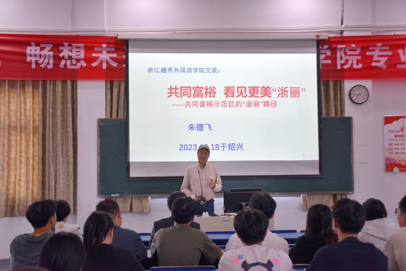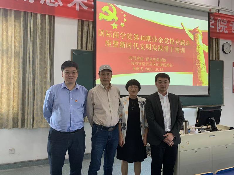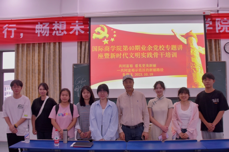 为深入学习贯彻习近平总书记考察浙江重要讲话精神,积极宣贯浙江省高质量发展建设共同富裕示范区的相关精神。国际商学院于2023年10月18日下午在1-501举办第40期业余党校专题讲座暨新时代文明实践骨干培训。丽水市教育教学研究院资深教研员、浙江师范大学兼职教授硕士生导师、浙江外国语学院“重要窗口”研究所特聘研究员朱德飞教授受邀作题为“共同富裕 看见更美浙丽”的主题讲座。讲座由国际商学院党委书记李建凤教授主持,科研处副处长王佳桐博士、国际商学院党委副书记凌玮博士及各学生党支部书记们出席本次讲座。