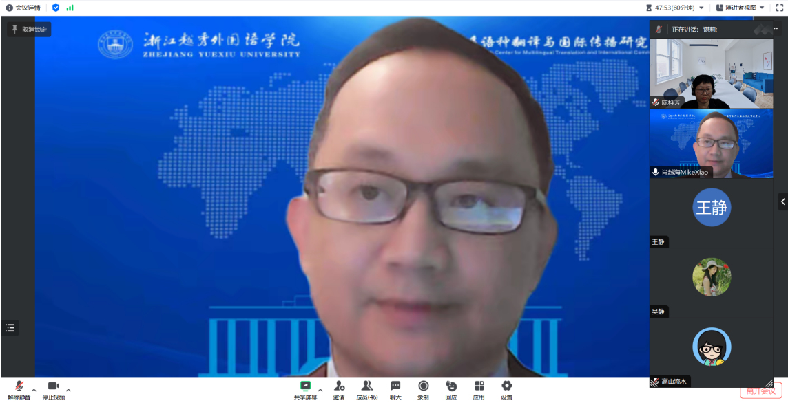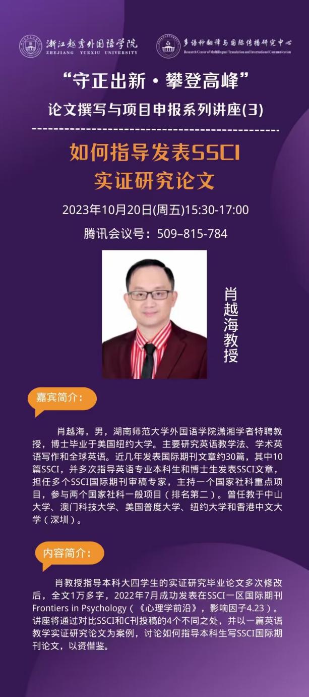 10月20日下午,英语学院及多语种翻译与国际传播研究中心邀请湖南师范大学外国语学院潇湘学者肖越海教授为足球一世官网教师开展了主题为“如何指导本科生发表SSCI实证研究论文”的线上讲座。肖教授是湖南师范大学外国语学院特聘教授,博士毕业于美国纽约大学,曾多次指导英语专业本科生和博士生发表SSCI文章。担任多个SSCI国际期刊审稿专家,曾任教于中山大学、澳门科技大学、美国普度大学、纽约大学和香港中文大学(深圳)。讲座由英语学院副院长谌莉副教授主持,全校教师60多人参加。