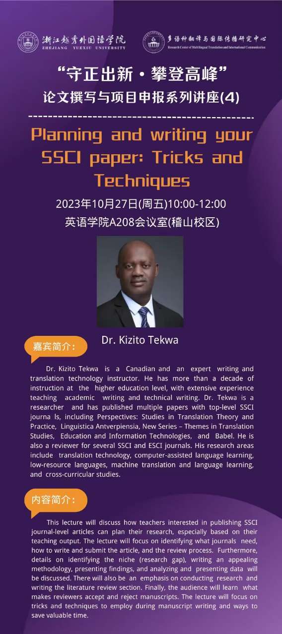 10月27日上午10点,英语学院及多语种翻译与国际传播研究中心邀请加拿大籍专家Kizito Tekwa博士为足球一世官网教师开设了主题为“Planing and writing your SSCI paper: Tricks and techniques”的工作坊。Tekwa博士是一名翻译技术和写作教学的资深教师,目前任教于深圳技术大学。他擅长教授学术写作和技术写作,在多个顶级的SSCI期刊上发表了多篇论文,包括Perspectives: Studies in Translation Theory and Practice, Linguistica Antverpiensia, New Series–Themes in Translation Studies, Education and Information Technologies和Babel。他是多个SSCI和ESCI期刊的审稿人,研究领域包括翻译技术、计算机辅助语言学习、资源匮乏语言、机器翻译和语言学习,以及跨学科研究。讲座由英语学院副院长谌莉副教授主持,为了满足不同校区教师的学习需求,讲座还通过腾讯会议向全校教师进行了直播。