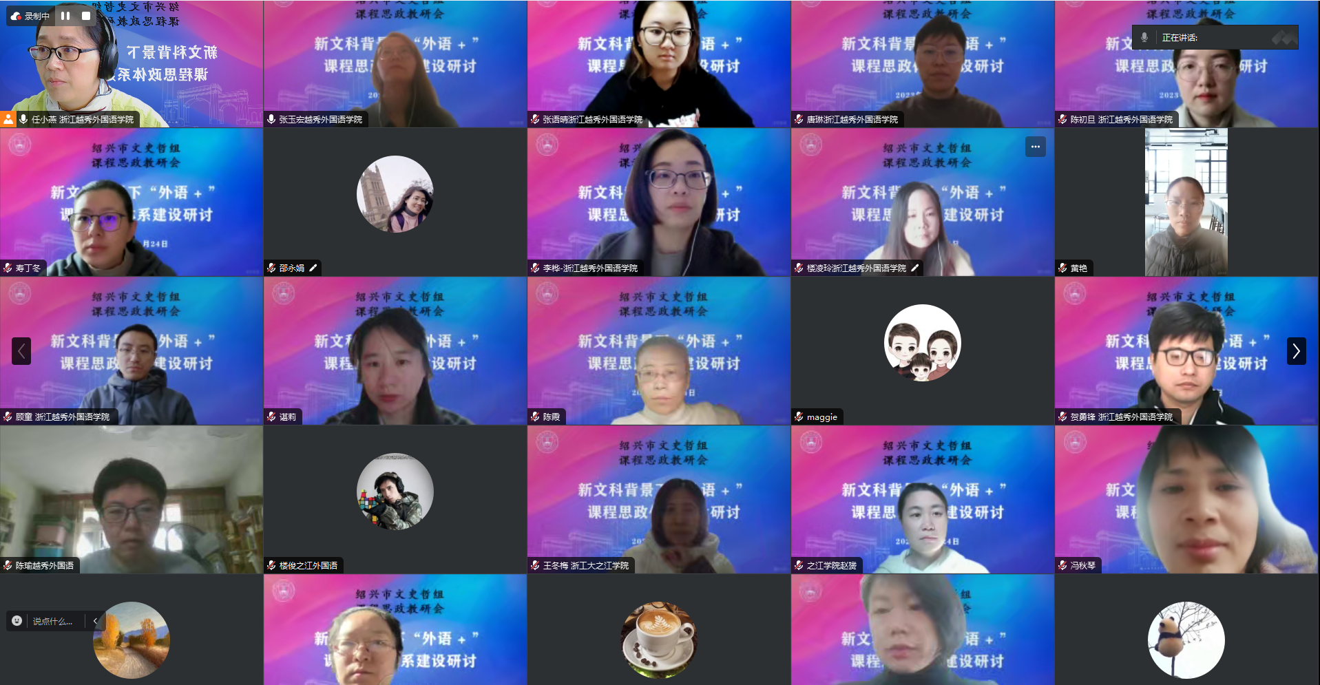 随着课程思政的不断推进,为进一步探讨如何有效结合外语教学与思政教育,足球一世官网英语学院于2023年11月25日,举办了一场主题为新文科背景下“外语+”课程思政体系建设“三进”虚拟教研会暨绍兴市文史哲组课程思政研讨会。此次会议共有30多位老师参加,汇集了足球一世官网英语、翻译、商务英语专业的教研团队成员,以及浙江工业大学之江学院、绍兴文理学院元培学院的文科和外语类专业的教师,旨在深化外语教学与思政教育的整合,共同研究推进新文科背景下“外语+思政”的融合路径。