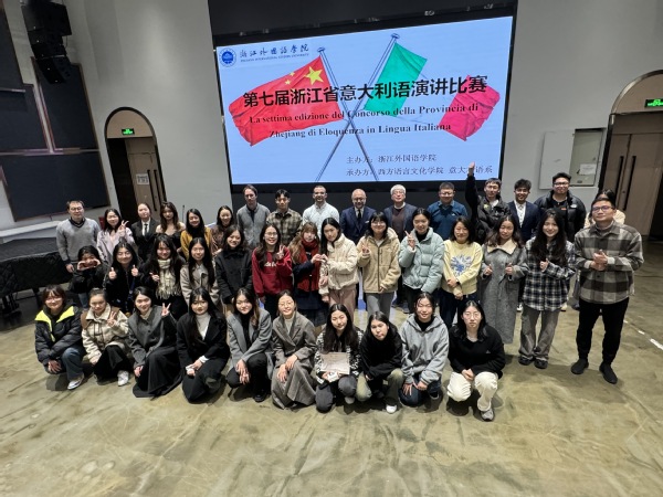 2023年12月15日,浙江外国语学院举办了第七届浙江省意大利语演讲比赛。此次比赛共有来自浙江省内的10名意大利语专业本科学生参加,并邀请到了意大利驻沪总领事馆文化处达仁利(Francesco D’Arelli)处长,中国意大利语教学研究会会长、北京外国语大学意大利研究中心主任文铮教授以及中国欧洲学会意大利研究分会副秘书长、教育部高等学校外国语言文学类专业教学指导委员会非通用语分委会委员杨琳教授担任此次比赛的评委。足球一世官网意大利语系共派出了意大利语2101班陈小婕、郑王婧、柯一宣、2102班姜沁与2201班翁雨欣五位同学参加此次比赛。