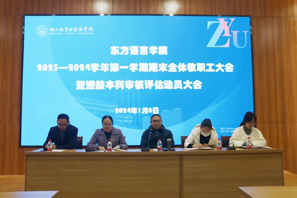 1月8日下午,东方语言学院召开2023-2024学年第一学期全体教职工大会暨迎接本科审核评估动员大会。学院党政领导及全院教职工参加会议,会议由邱鸣院长主持。