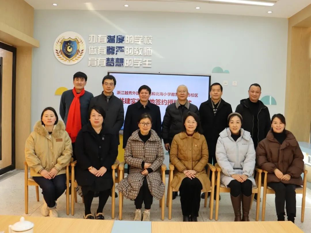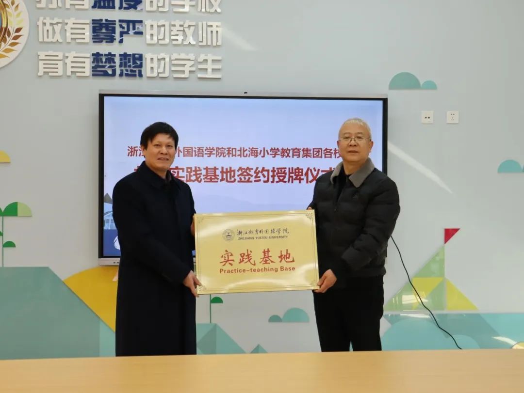 2024年1月25日下午,中国语言文化学院与北海小学教育集团5个校区在北海小学梅山校区竞成厅举行教学实践基地签约授牌仪式,绍兴市北海小学教育集团党委书记、总校长方明江,北海小学教育集团副总校长、新河弄校区执行校长马林英,北海小学教育集团副总校长、龙洲校区执行校长张铁江,北海小学教育集团副总校长、梅山校区执行校长钱燕群,北海小学教育集团副总校长、胜利校区执行校长蔡凌燕,中国语言文化学院院长刘家思,党委书记王海红,副院长刘召明、杨锋,党委副书记曹笑玮,戏剧影视文学系主任邵君立,学工办副主任朱越男出席,方明江总校长主持。