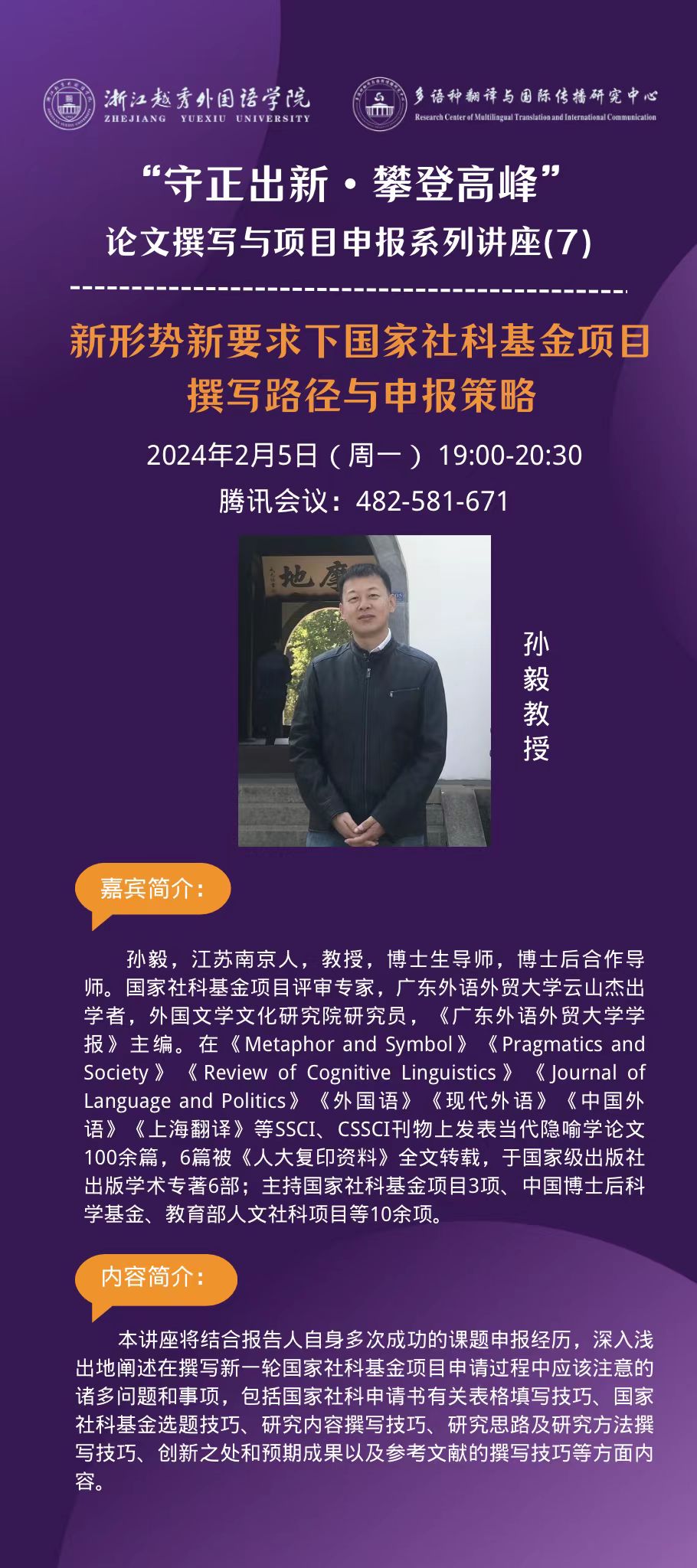 2024年2月5日,广东外语外贸大学云山杰出学者孙毅教授受英语学院及多语种翻译与国际传播研究中心邀请,为足球一世官网师生开展了主题为“新形势新要求下国家社科基金项目撰写路径与申报策略”的讲座(腾讯会议:482-581-671)。讲座由英语学院院长陈科芳教授主持,全校近70余位教师参加。