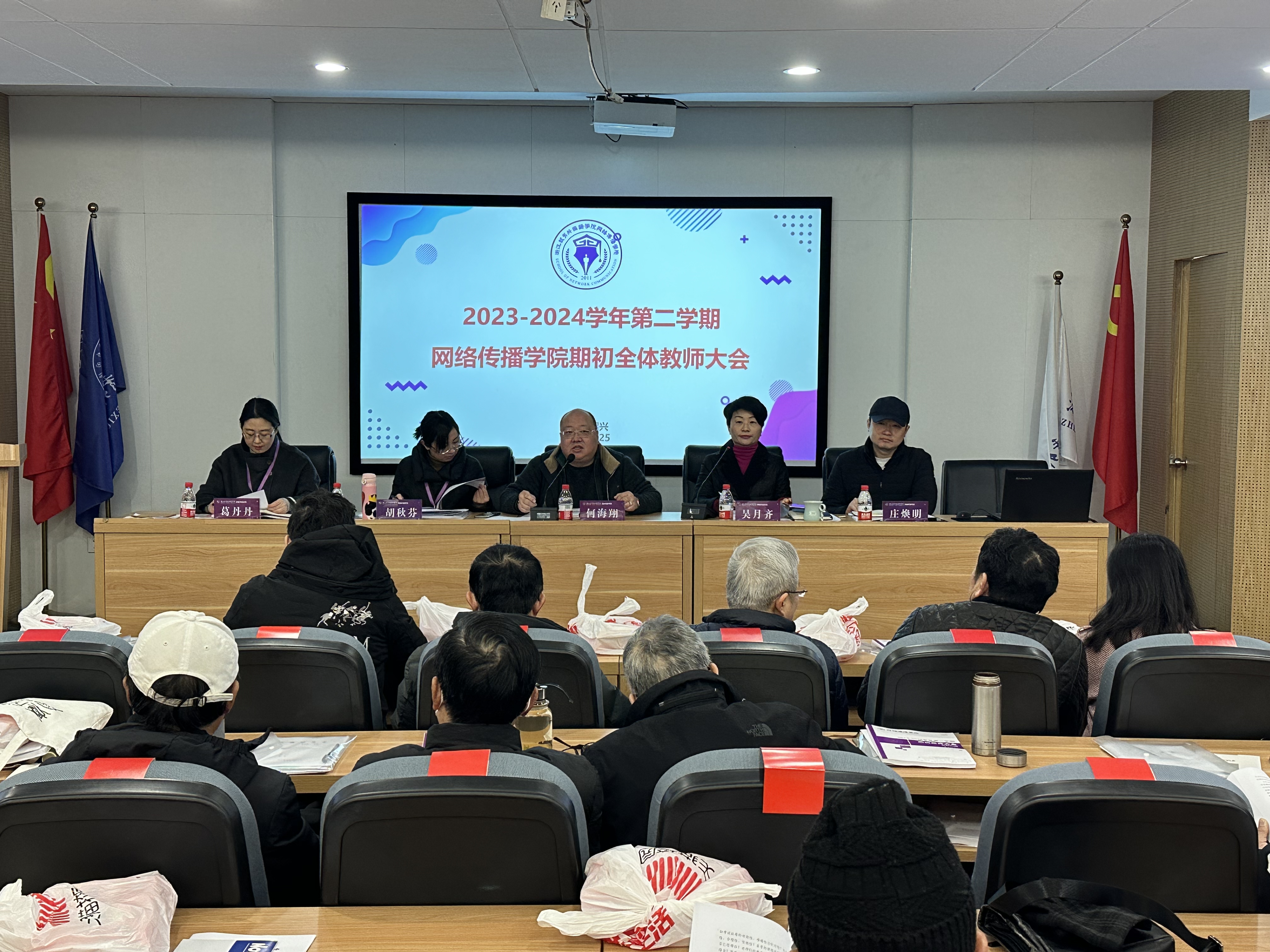 2024年2月25日,在4-301召开网络传播学院2023-2024学年第二学期期初全体教师大会,对本年度本科教育教学审核评估工作和主题教育进行再动员,对学院2024年工作重点进行部署。会议由学院党委书记吴月齐主持,何海翔院长、胡秋芬副院长、庄焕明副院长、葛丹丹副书记及全体教职员工出席会议。