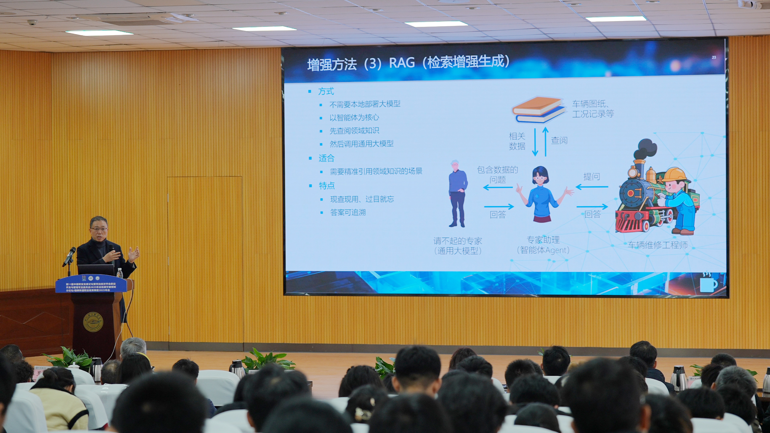 主题报告环节,电子科技大学王正宁教授解读AI在智能调度、安全预警、运维检测等场景的应用前景;西南交通大学何庆教授分享AI在铁道工程智能设计与教学中的创新实践;成都工业学院沈益民教授结合案例分析数据驱动下AI在能耗优化、设备诊断等领域的应用趋势与挑战。