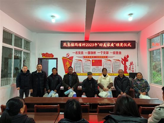 池秋平一行来到玛瑙村,举行2023年“四美家庭”颁奖仪式。今年全村共评选出 “四美家庭”36户,发放奖励物资0.5万元。池秋平和张翔分别为受表彰家庭颁发奖品,受表彰群众对学校的真情帮扶纷纷表达感谢,并表示会珍惜荣誉,起好示范作用。