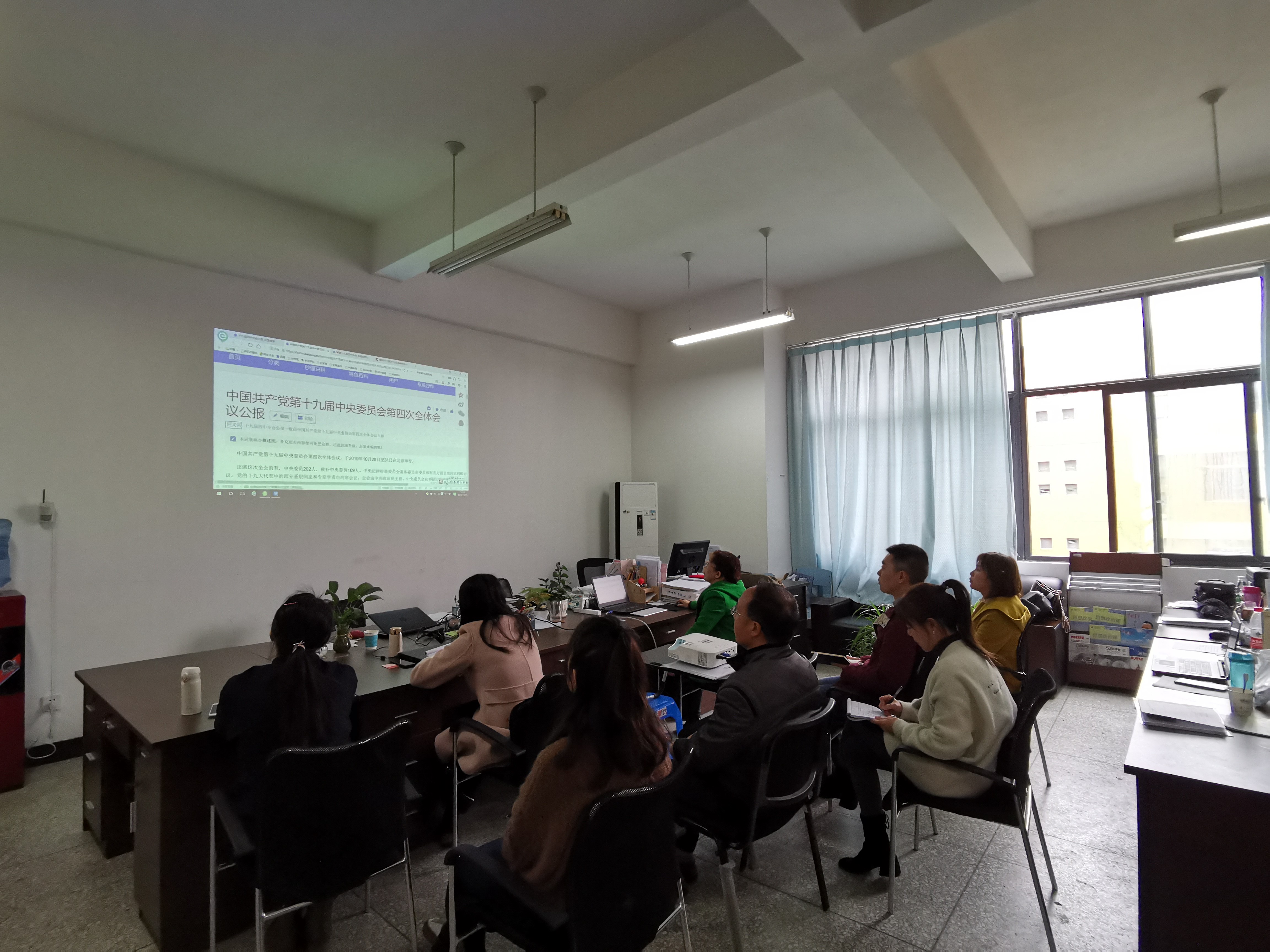 中国共产党第十九届中央委员会第四次全体会议于10月28日到31日在京召开。为深入学习贯彻党的十九届四中全会精神。思政党支部于11月11日组织全体党员教师在2404教室进行学习。