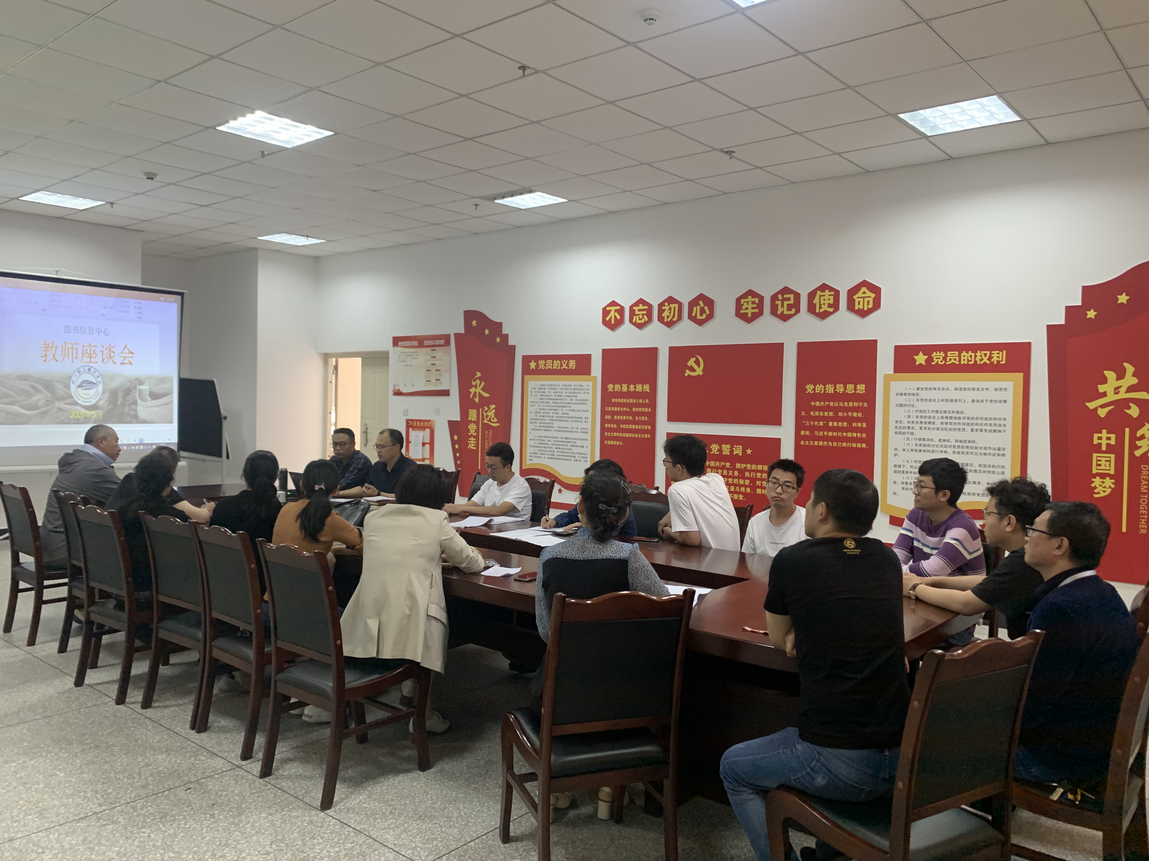 根据《pp电子游戏官网隆重庆祝中国共产党成立100周年工作方案》、《pp电子游戏官网党史学习教育实施方案》要求,图书信息中心认真落实“我为师生办实事”。5月24日下午,图书信息中心于图书馆三楼会议室开展部门教师座谈会,会议由中心主任凌杰和支部书记何中华主持,部门全体人员参会。部门负责人及科室负责人通过座谈会了解老师们的情况、掌握了老师们的所思所盼。