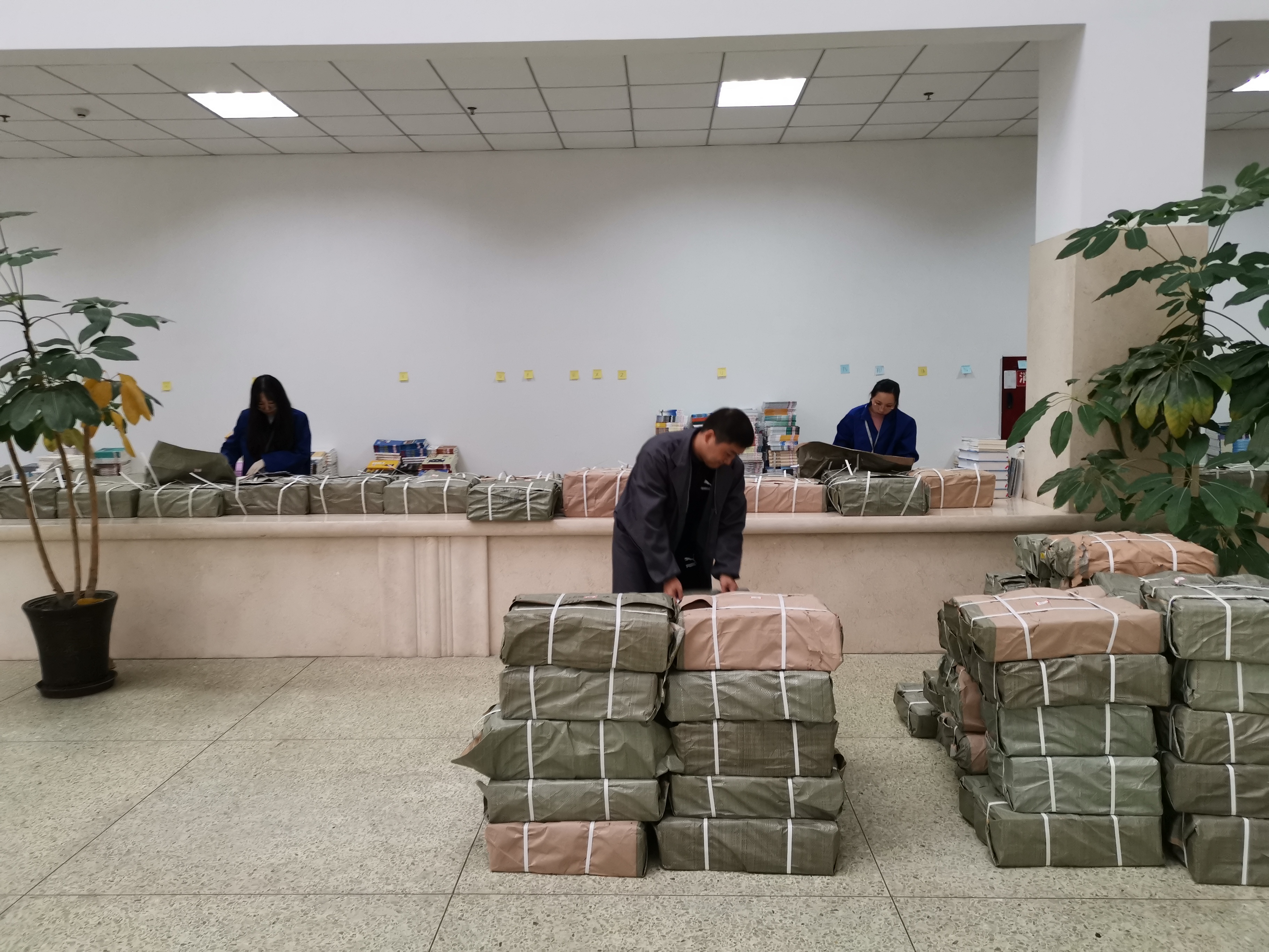 为尽快将新书入库上架供师生借阅,图书馆员们正马不停蹄地对新书进行拆包验收。