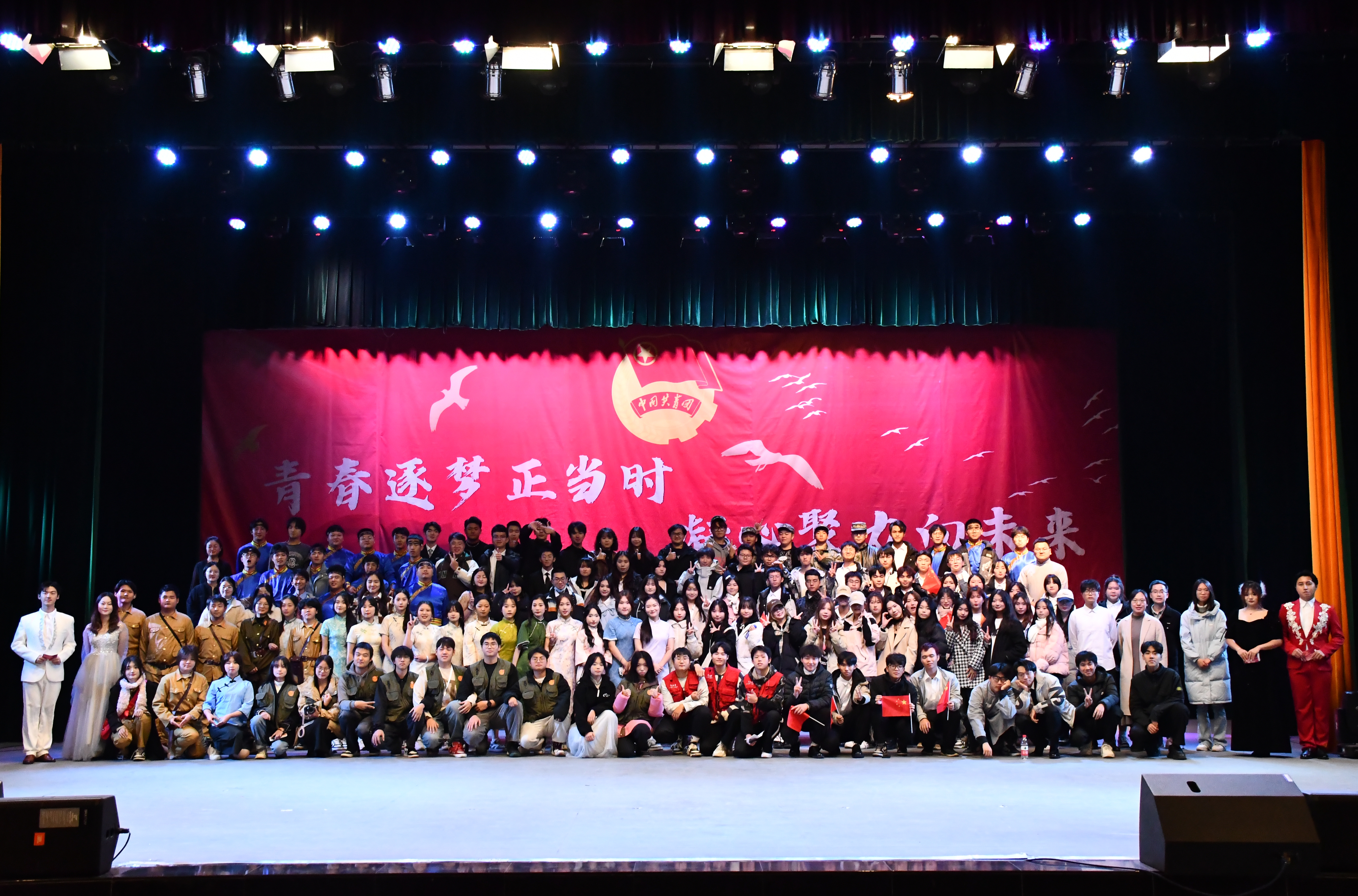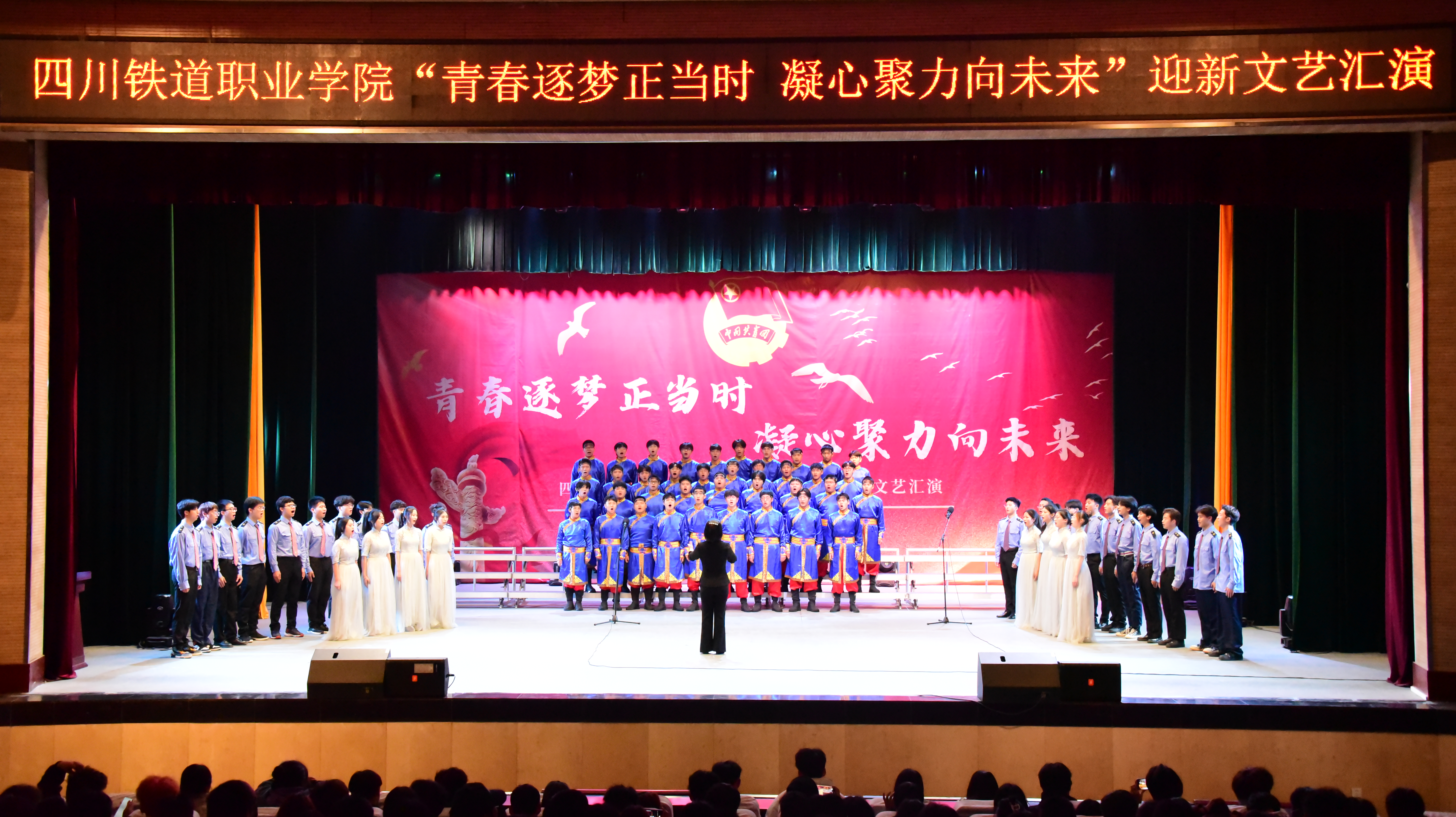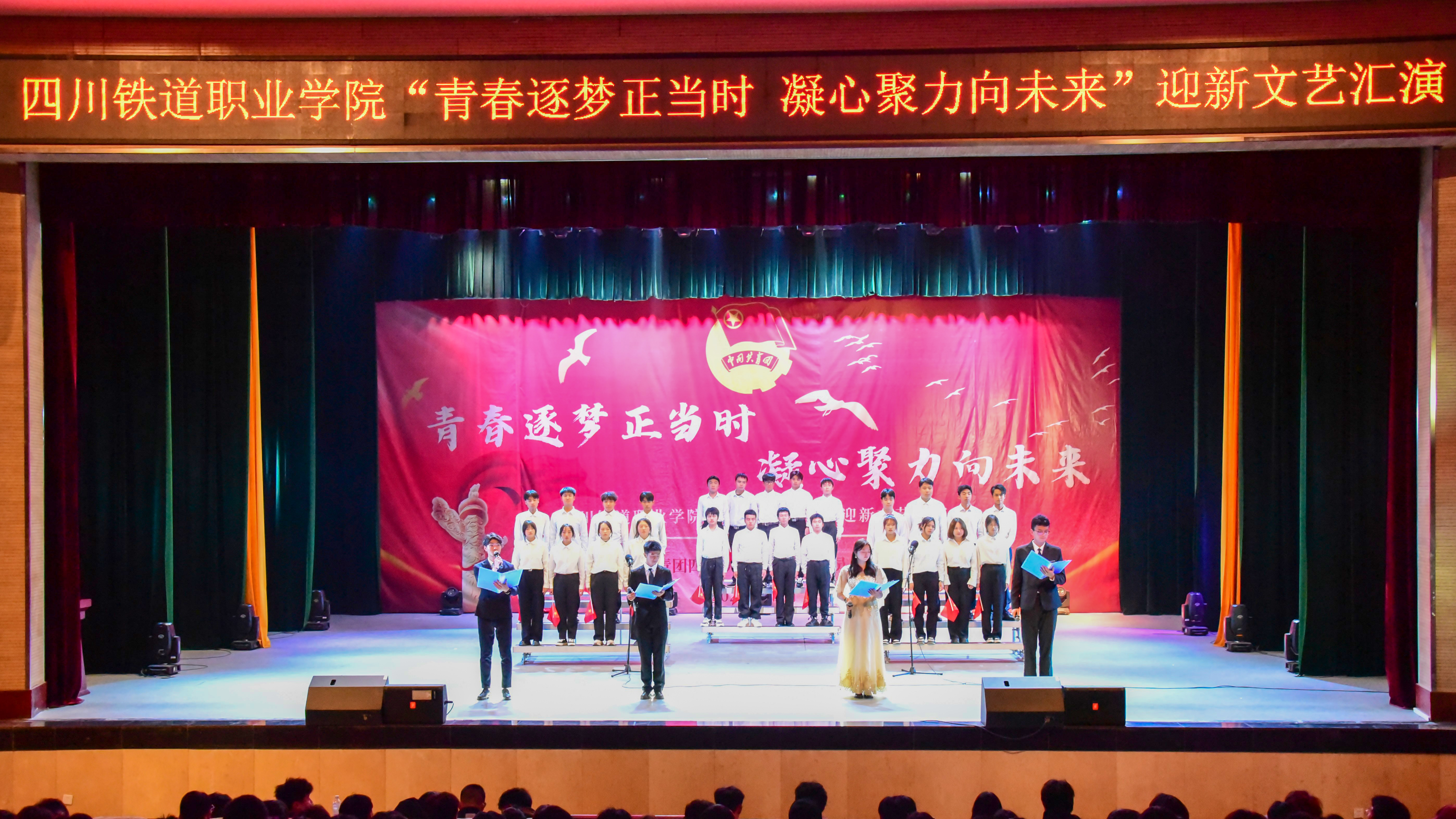 大学生艺术团器乐部以炫酷的乐队表演《淋雨一直走》点燃了全场激情,向所有观众传递出最热烈的问候,由此拉开了晚会序幕。舞蹈表演《大艺术家》《That’s my girl》和《怪火》,以有力的舞姿与节奏感十足的音乐洋溢出青春的活力,现场气氛达到沸点,掌声与欢呼此起彼伏。舞台剧《金陵十三钗》使观众们在领略曼妙舞姿的同时,深刻感受浓厚而壮烈的爱国之情。器乐演奏《路小雨》悠扬绵长的笛声,就好似拂过耳畔的清风,沁人心脾,配以精彩的钢琴和小提琴演奏,将大家带入美妙的艺术境界。小品《军训四才子》让大家感同身受,军训是严于律己、内外兼修的大课堂,付出终能收获成长。歌曲《唯一》和《你的答案》旋律优美,传递出满满的正能量。朗诵《强国有我 青春担当》抒发了同学们对祖国无比的崇敬和深沉的热爱,作为青年一代应该怀揣梦想、勇于实践,在实现中华民族伟大复兴中国梦的征程中贡献青春力量。合唱《欢乐的那达慕》无不展现出蒙古族人民热情奔放的风土人情,也表达了川铁学子斗志昂扬的青春气息。最后,晚会在同学们饱含深情的校歌合唱中圆满落下帷幕。