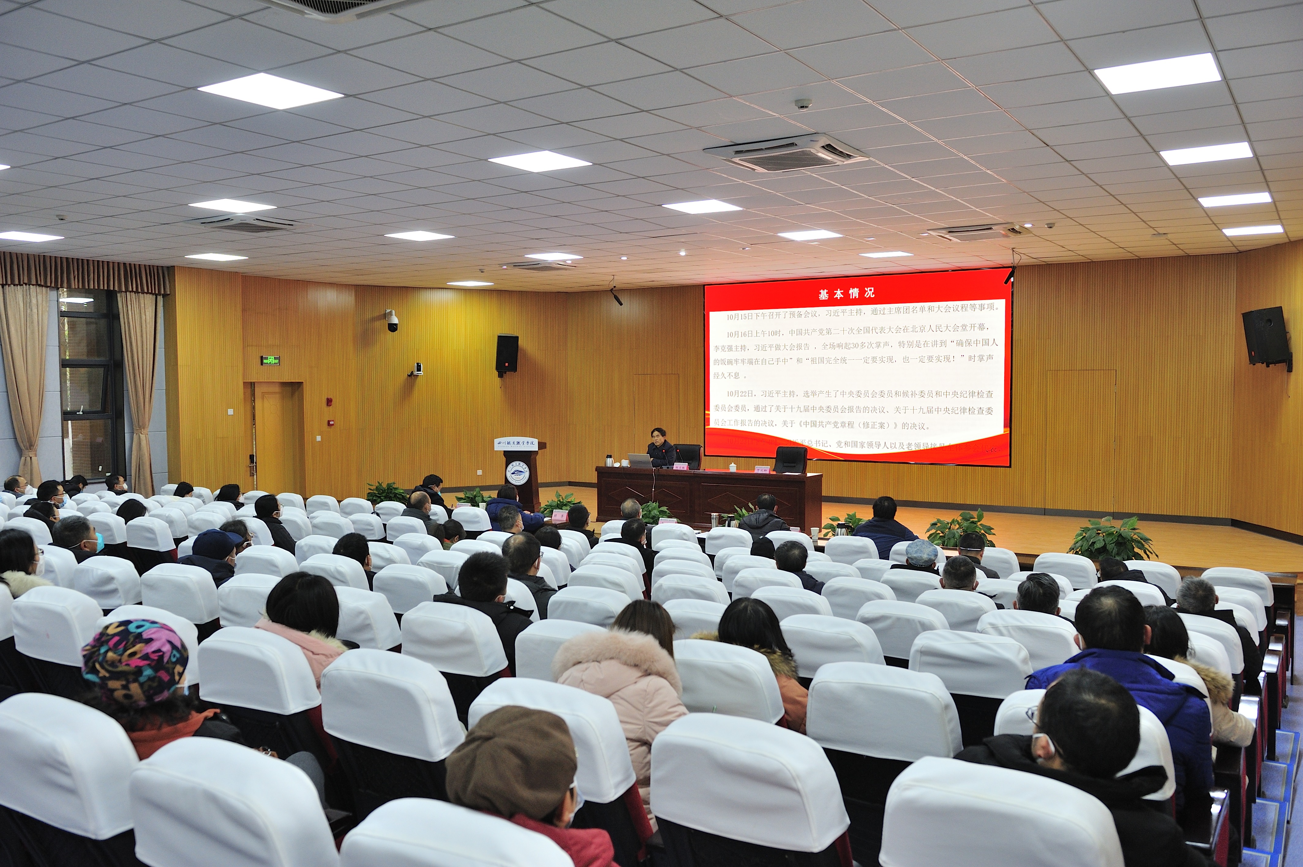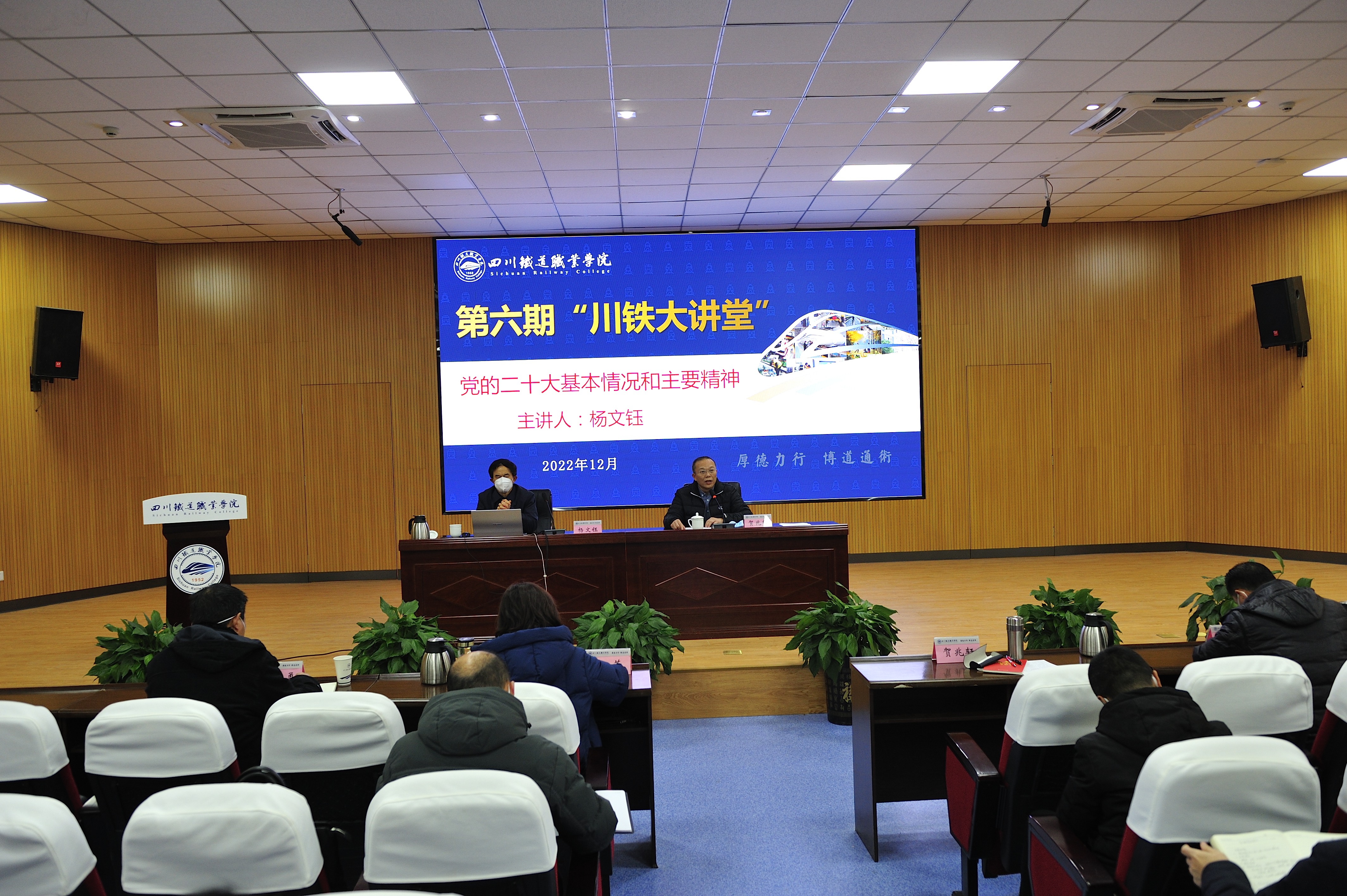 贺兆轩主持会议并指出,杨文钰教授的辅导报告既有政治高度和理论深度,又富有人文精神和家国情怀。报告以小见大,通过一些小切口、小花絮和小故事,讲明了党的二十大召开的重大意义,阐释了职业教育的发展要求,为全校师生上了一堂生动鲜活的专题党课,对全校师生学习贯彻党的二十大精神具有重要启发和指导作用。 贺兆轩强调,全校上下要以此次宣讲为契机,持续兴起学习宣传贯彻党的二十大精神的热潮,常学常新、常思常悟、不断深化;要把思想和行动统一到二十大精神上来,立足国家重大战略部署,紧抓职业教育重大发展机遇,切实把二十大精神贯彻落实到学校改革发展的各项事业中,以永不懈怠的精神状态和一往无前的奋斗姿态,为建成轨道交通鲜明、国内一流高职院校而团结奋斗。