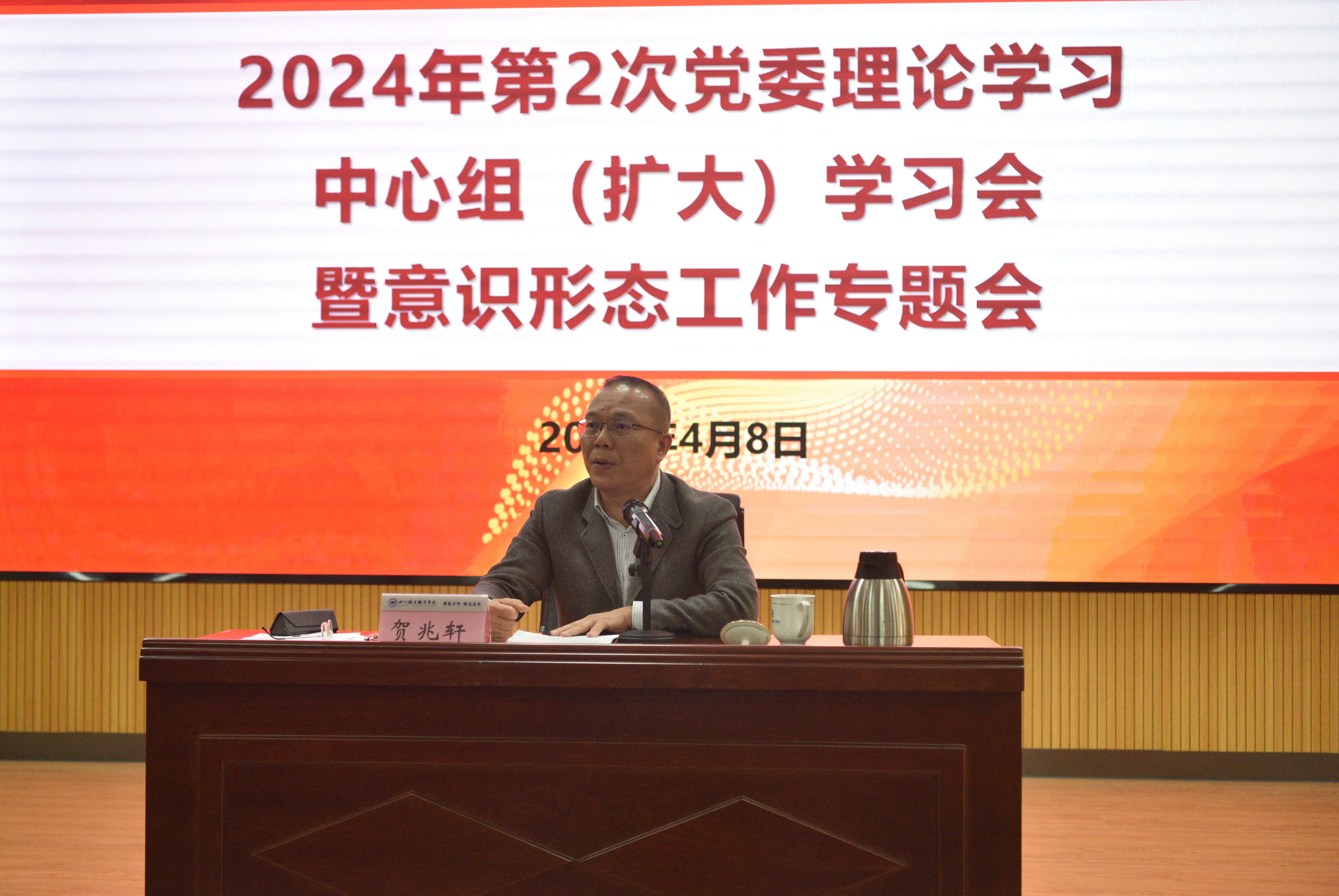 4月8日上午,学校在学术报告厅召开2024年第2次党委理论学习中心组(扩大)学习会暨意识形态工作专题会,学习全国两会精神,学习领会习近平总书记关于“新质生产力”的重要讲话精神和指示批示精神,对学校意识形态形势进行研判。会议由党委书记贺兆轩主持。