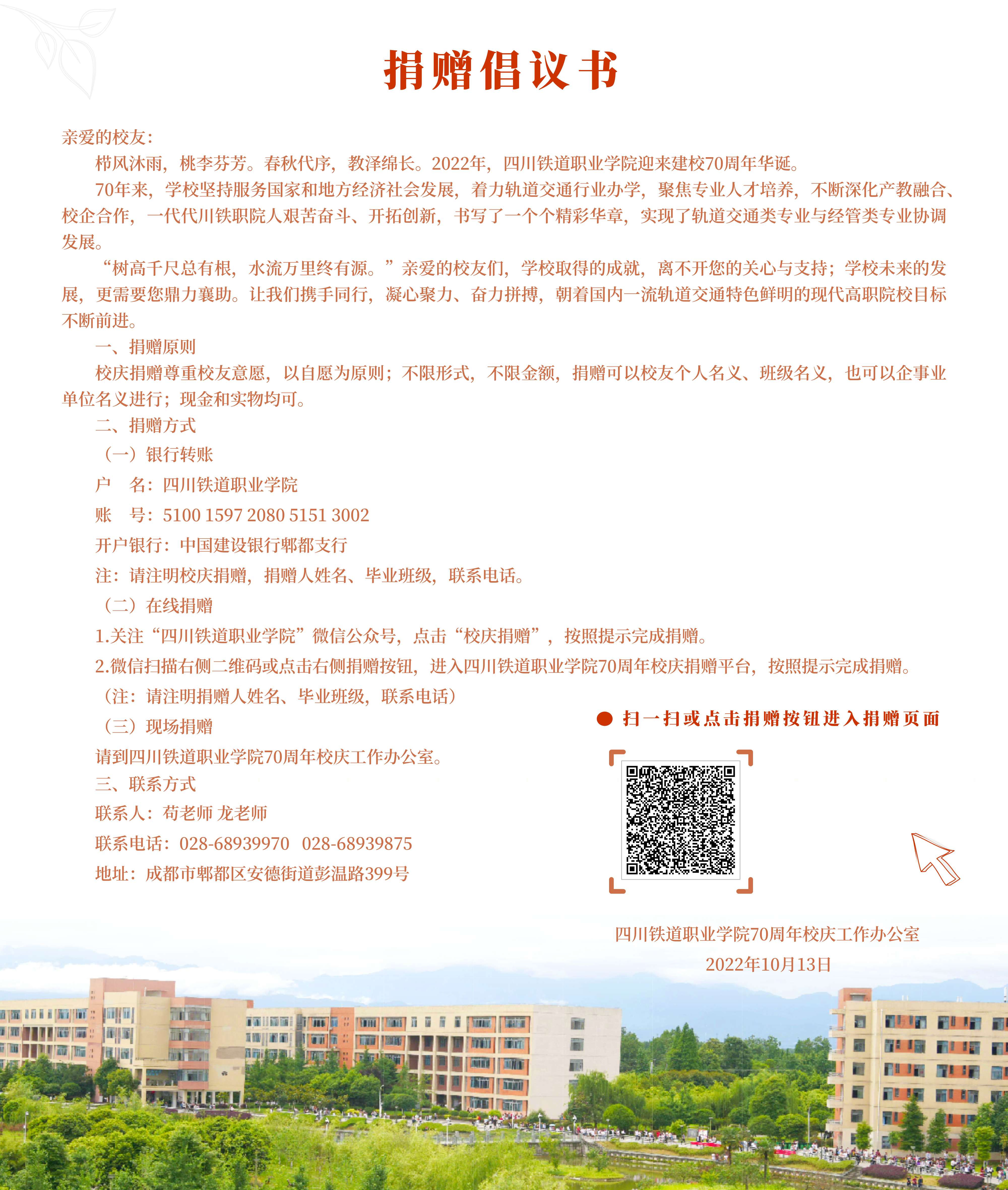 70周年校庆工作办公室 联系我们 电话:028-68939970 028-68939908 电子邮箱:scrc70xqb@163.com