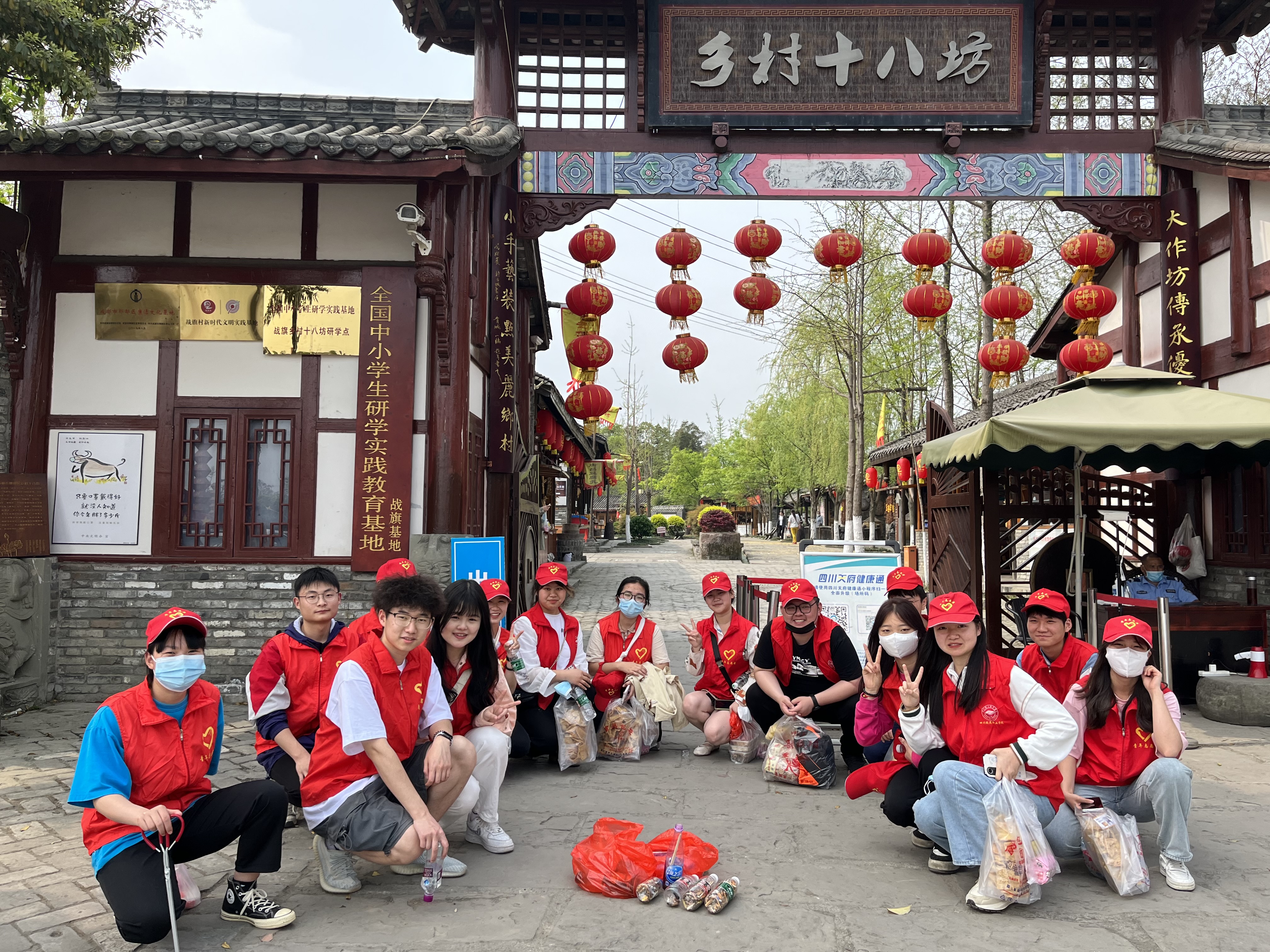 志愿者们身穿红马甲,拿着火钳、扫把和塑料袋等工具,在战旗村搜索着路面上、绿化带、路边各个角落、卫生死角等可见的垃圾、烟头等垃圾,将它们捡起分装到垃圾袋中,同时,倡导在村里乘凉、野餐、游玩的居民爱护环境卫生。