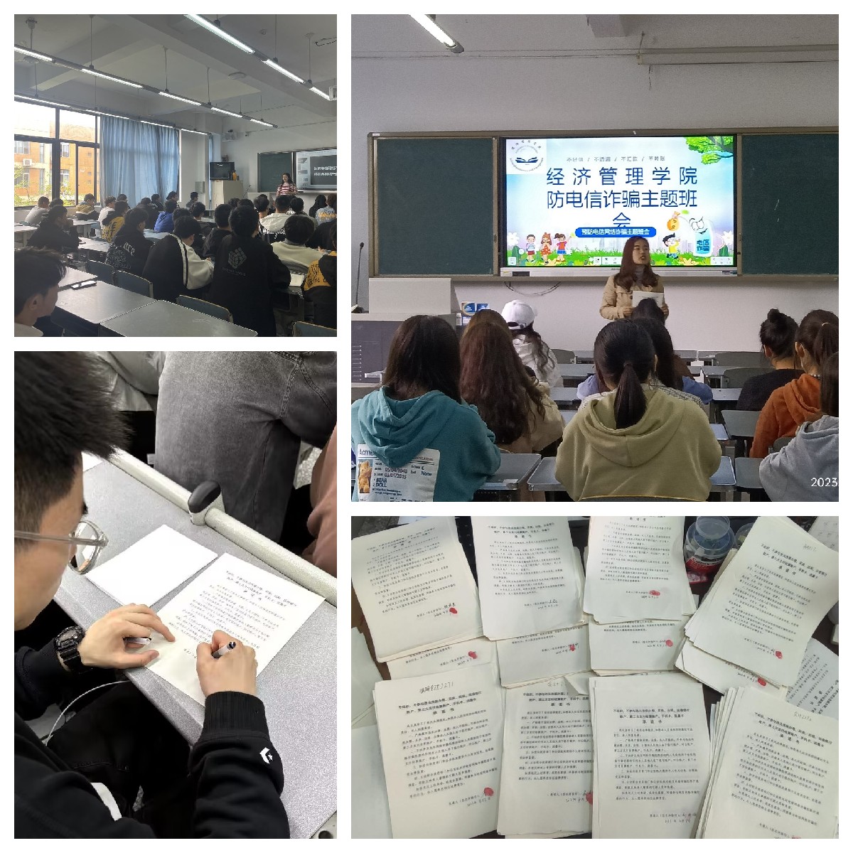 班会课上,辅导员们通过案例分析、播放警示视频的方式,让同学们更直观的了解电信网络诈骗的主要手段,从校园诈骗的情况、现状、高发案件类型等内容进行了详细介绍和分析。并对防诈骗方法及被骗后的处理方案进行科普,提醒同学们注意个人信息保护,谨防电信诈骗,保护好自己的人身和财产安全,遇到财产安全的事情尽量做到“借钱不给,给钱不要”。一旦遇到被诈骗或者疑似诈骗的情况,第一时间向辅导员报告。会后,同学们以班级为单位签署防范网络电信诈骗承诺书,强化防范意识。