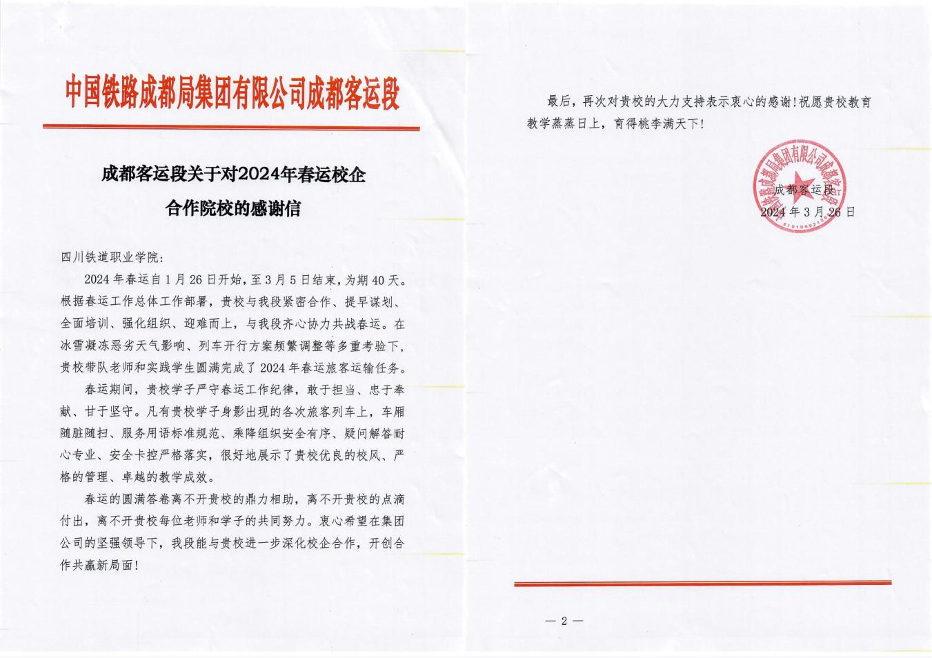近日,pp电子收到中国铁路成都局集团有限公司成都客运段感谢信,来信对pp电子“祖国再大,我也要助您平安回家”春运社会实践暨志愿服务的组织和志愿服务工作给予充分肯定和高度赞扬。信中提到,pp电子志愿者严守工作纪律,敢于担当、忠于奉献、甘于坚守,凡是有pp电子志愿者身影出现的各次旅客列车上,车厢随脏随扫、服务用语标准规范、乘降组织安全有序、疑问解答耐心专业、安全卡控严格落实,很好地展示了学校优良的校风、严格的管理、卓越的教学成效。