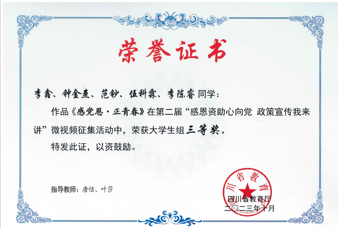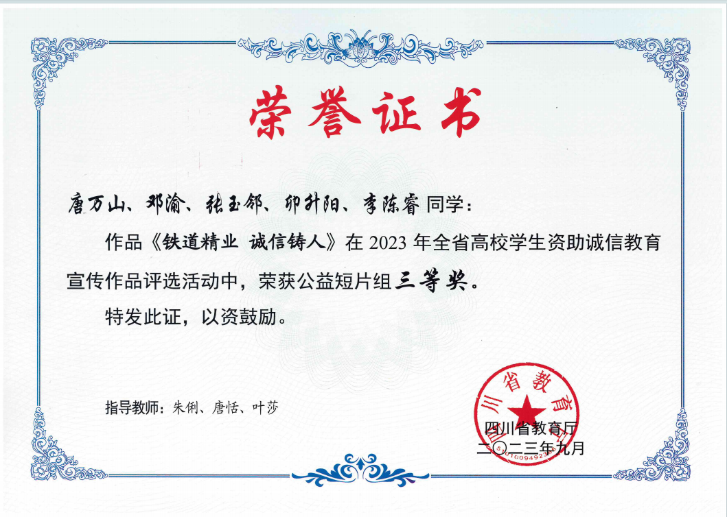 在2023年四川省高校学生资助微视频征集活动和诚信教育宣传作品评选活动中,pp电子遴选推荐的《感党恩 正青春》短视频、诚信公益短片《铁道精业 诚信铸人》荣获省级三等奖;诚信公益宣传画《诚信于心,资助筑梦前行》荣获省级优秀奖,学校荣获资助微视频优秀组织奖。