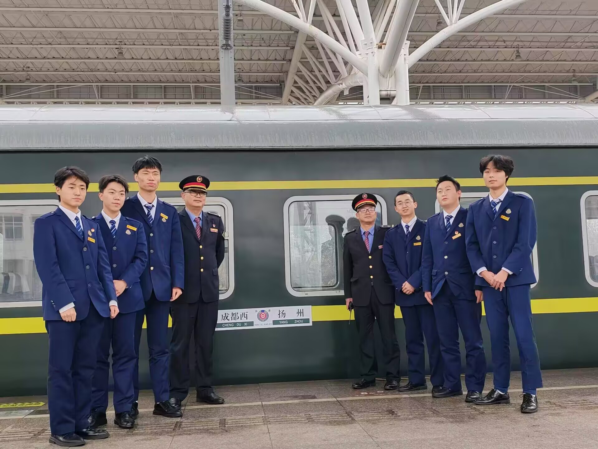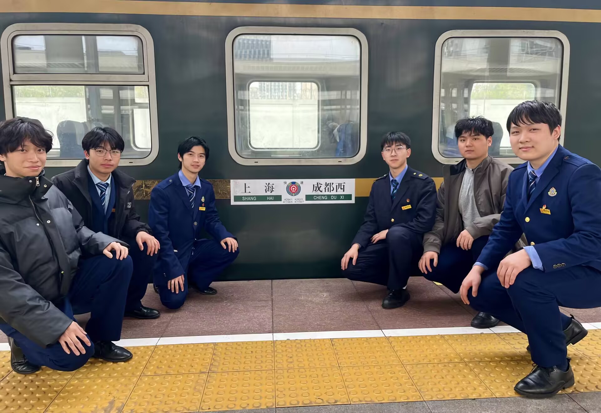 上海车队,国际窗口的青春名片。志愿者面对上海枢纽密集的铁路班次和复杂客流,在完成车厢清洁、行李规整等基础服务的同时,精准掌握列车时刻、站台布局等信息,高效开展旅客引导及换乘咨询,特别针对春运期间外籍旅客增多的情况,志愿者凭借着良好的英语水平和沟通能力,为国际友人提供咨询服务,彰显川铁学子良好形象。