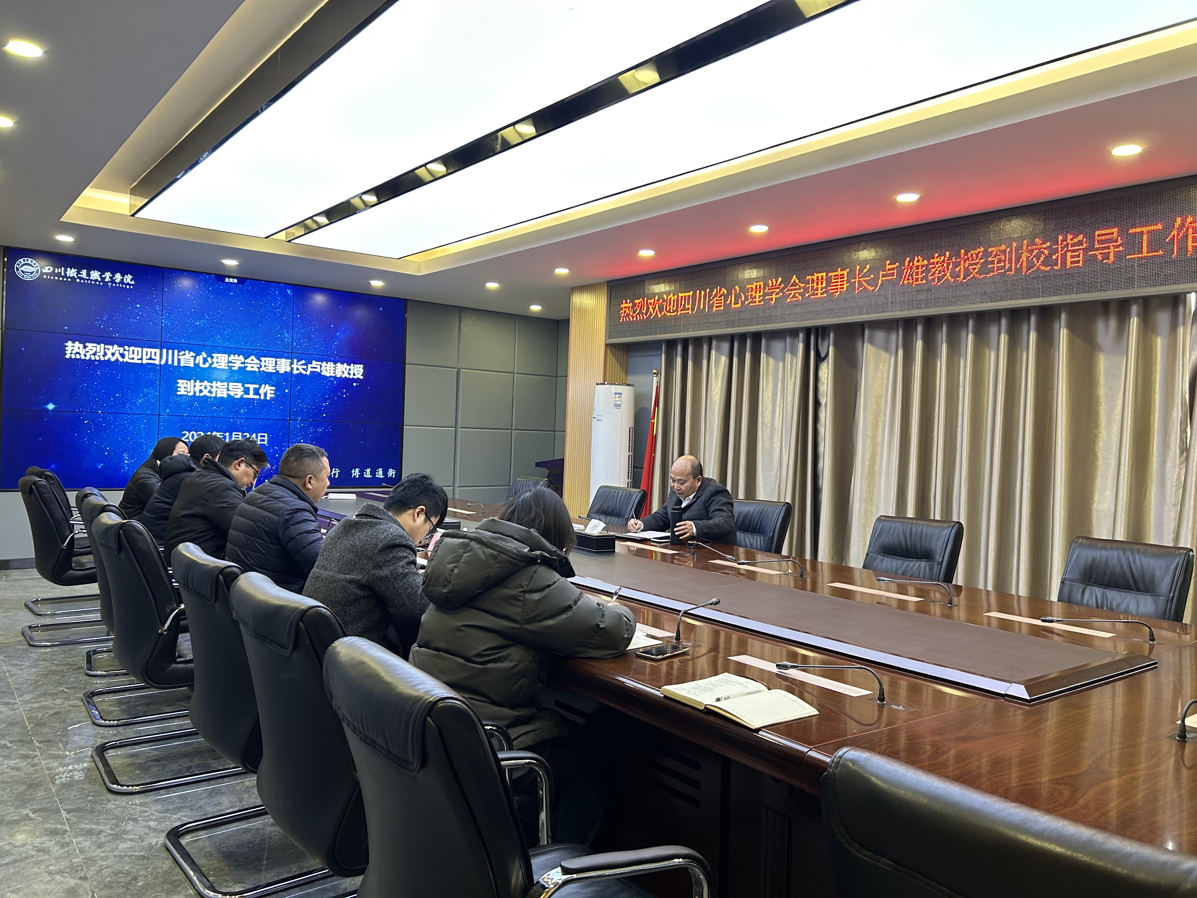 1月24日下午,四川省心理学会理事长卢雄教授应邀到pp电子指导心理健康教育工作。学校纪委书记池秋平、二级学院党总支书记及辅导员代表、党委学生工作部主要负责人、心理健康服务中心工作人员参加会议。会议由池秋平主持。